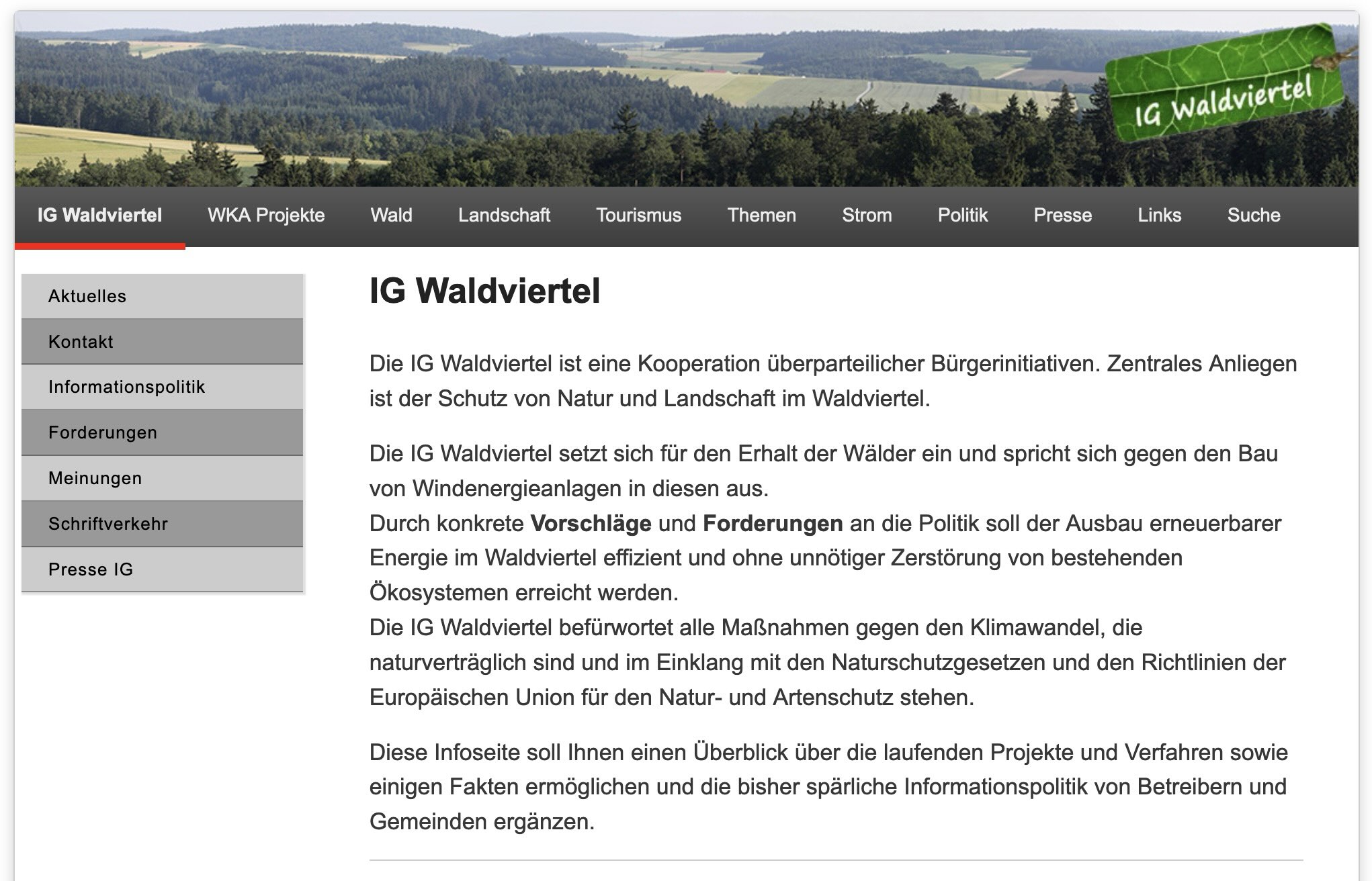 Die IG Waldviertel ist eine Kooperation überparteilicher Bürgerinitiativen. Zentrales Anliegen ist der Schutz von Natur und Landschaft im Waldviertel.