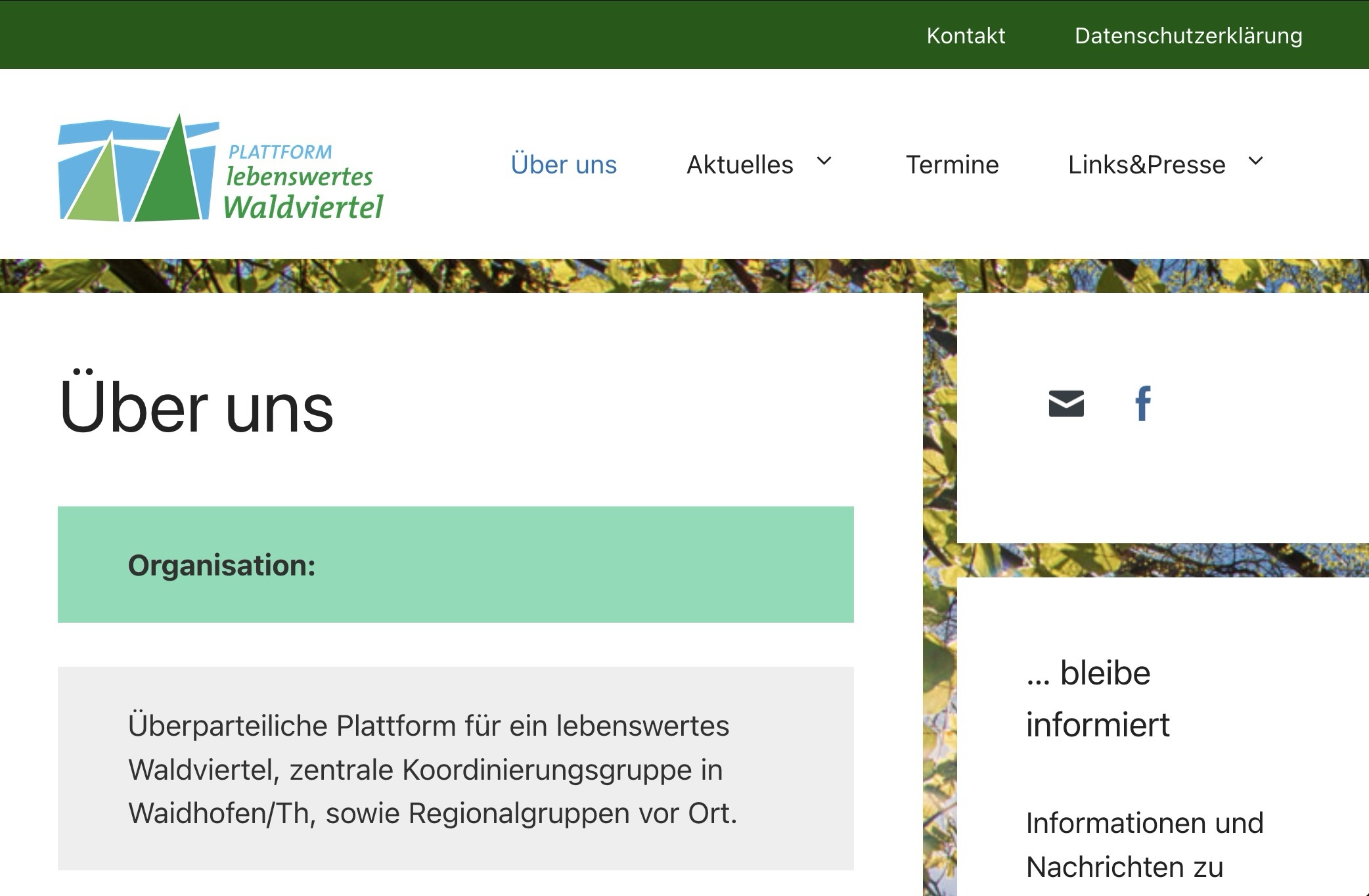 Überparteiliche Plattform für ein lebenswertes Waldviertel, zentrale Koordinierungsgruppe in Waidhofen/Th, sowie Regionalgruppen vor Ort.